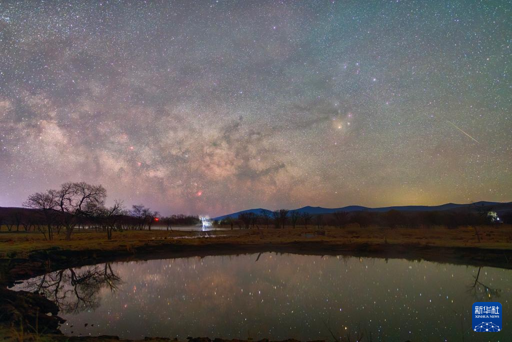 4月23日在哈尔滨市西泉眼水库拍摄的“银河之眼”和天琴座流星雨(拼接照片)。