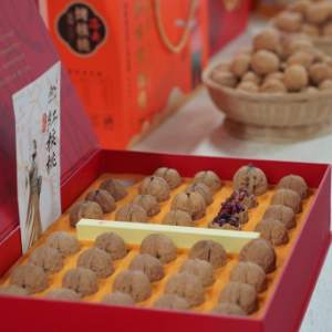 洛南县一家核桃生产企业展厅内展示的红仁核桃产品(4月22日摄)。