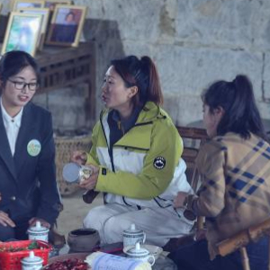 4月24日,在重庆市綦江区三角镇中坝村,短视频内容创作者庞芳(右)拍摄短视频推介内容。