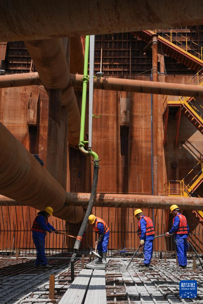 4月25日,中铁大桥局施工人员在杭州湾跨海铁路桥中航道桥81号主塔墩进行承台浇筑作业。