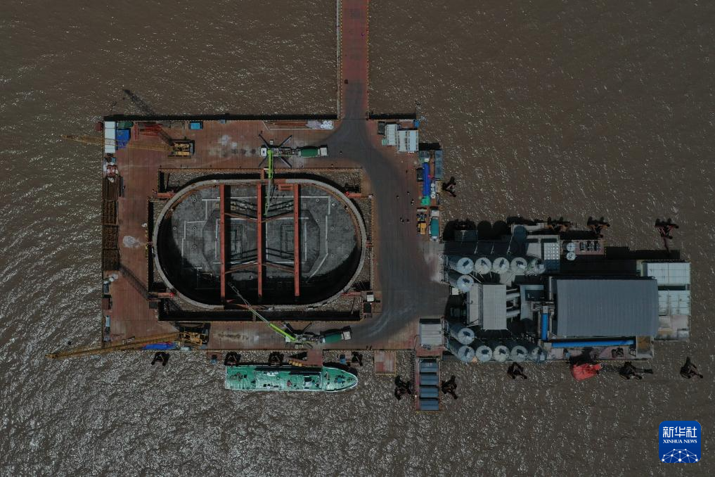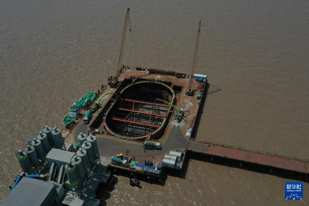 4月25日,中铁大桥局施工人员在杭州湾跨海铁路桥中航道桥81号主塔墩进行承台浇筑作业(无人机照片)。