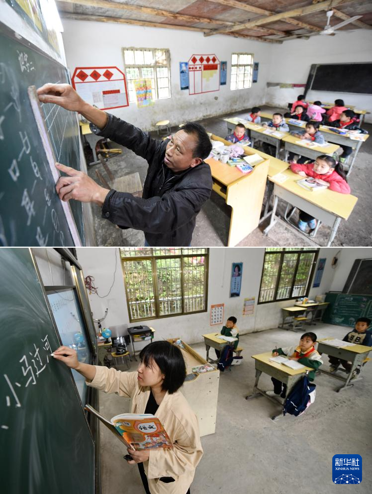 拼版照片:上图:在广西全州县蕉江瑶族乡苦马田教学点,卢加红老师给学生上课(2016年4月28日摄);下图:黄利老师给学生上课(2025年4月24日摄)。