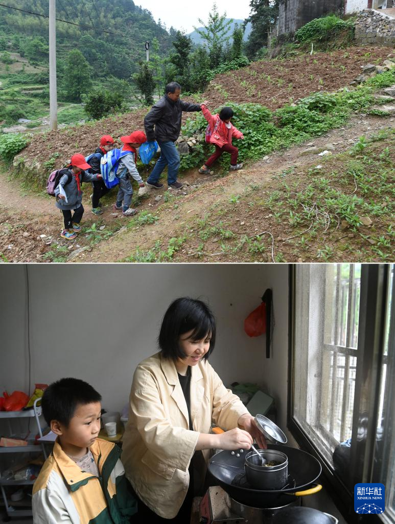拼版照片:上图:在广西全州县蕉江瑶族乡,卢加红老师领着学生回家吃午饭(2016年4月28日摄);下图:黄利老师在给一名学生热午饭(2025年4月24日摄)。