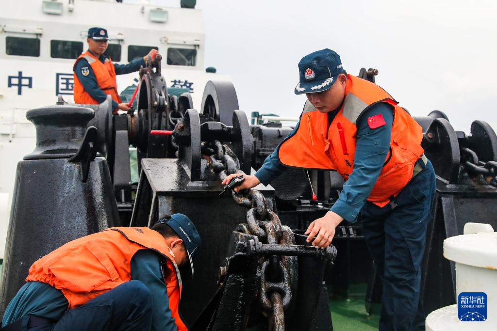 3月28日,在中国黄岩岛附近海域,高栏舰海警执法员开展抛锚训练。