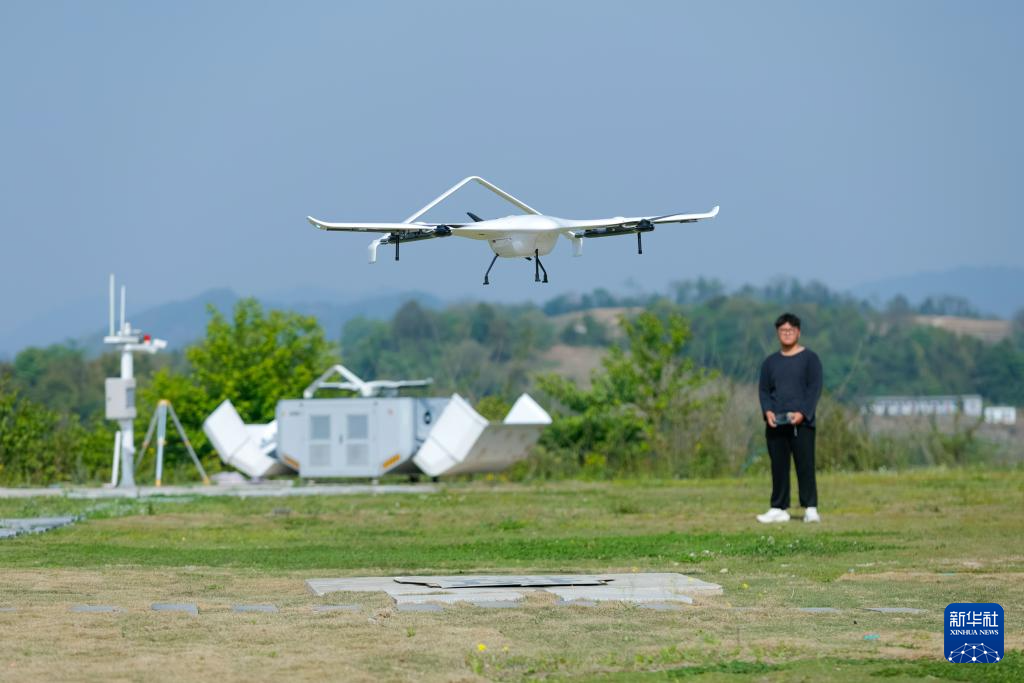 4月8日,在位于四川省成都市彭州市的国家级民用无人机驾驶航空试验基地“天空之眼”,工作人员在试飞一款垂直起降固定翼无人机产品。