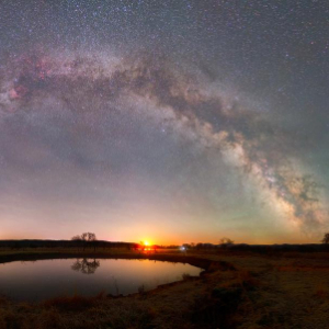 近日,夜空上演“银河之眼”奇观。从地平线升起来的银河,远看像是一座弯弯的拱桥,此时的月亮恰好运行至“银河拱桥”下方靠近中间的位置,二者共同组成一只“大眼睛”,被人们形象地称为“银河之眼”。