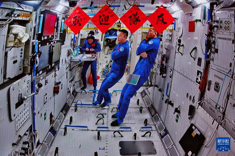 4月24日在北京航天飞行控制中心拍摄的神舟十九号乘组挂上了“欢迎队友”条幅。
