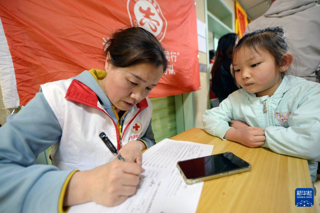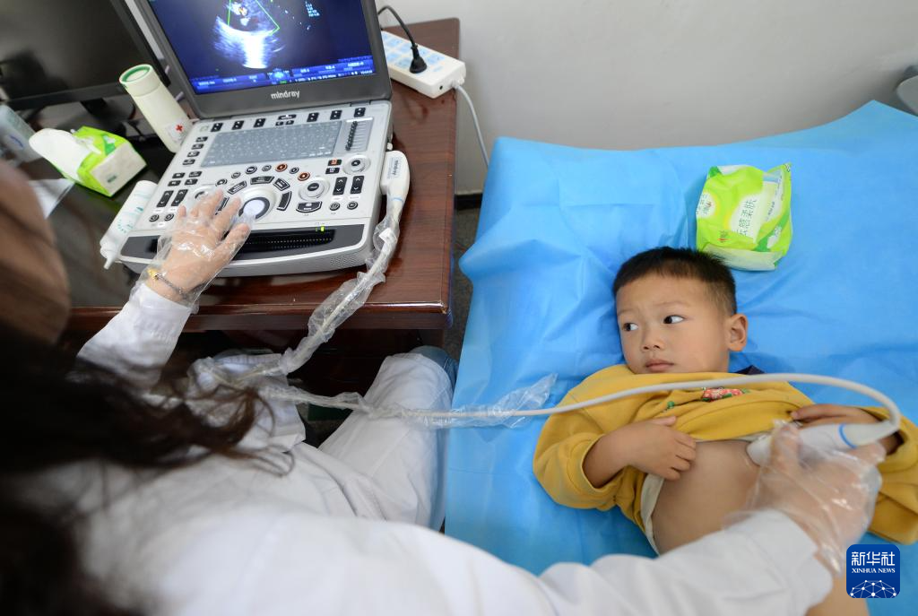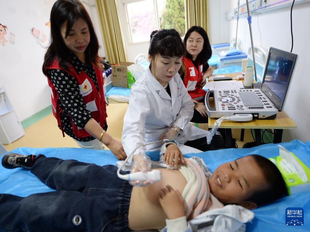 4月24日,在贵州黔西南布依族苗族自治州兴义西南医院,来自山东第一医科大学附属中心医院的医疗专家在为孩子做检查。