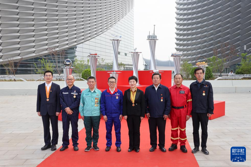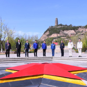 这是“人民工匠”许振超(左七)等在陕西延安宝塔山劳模致敬仪式拍摄现场(4月24日摄)。