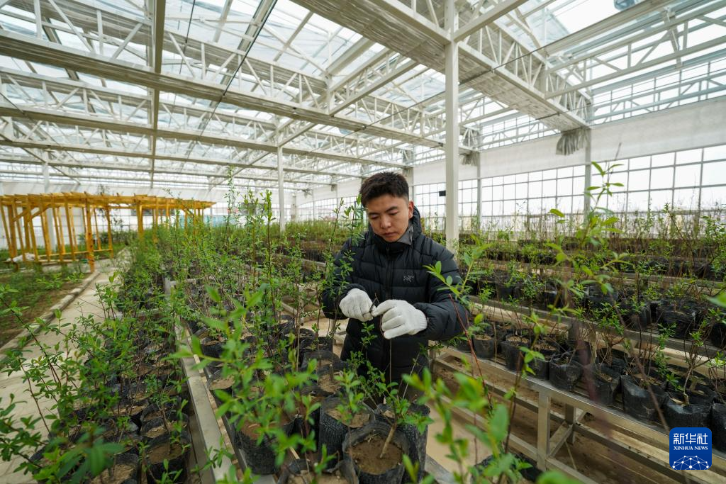 4月25日,那曲市林业和草原局工作人员在那曲高寒高海拔乡土树种培育基地给树苗剪枝。