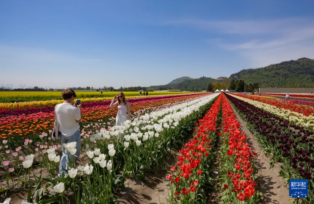4月25日,在加拿大阿伯茨福德市,人们在郁金香田中漫步。