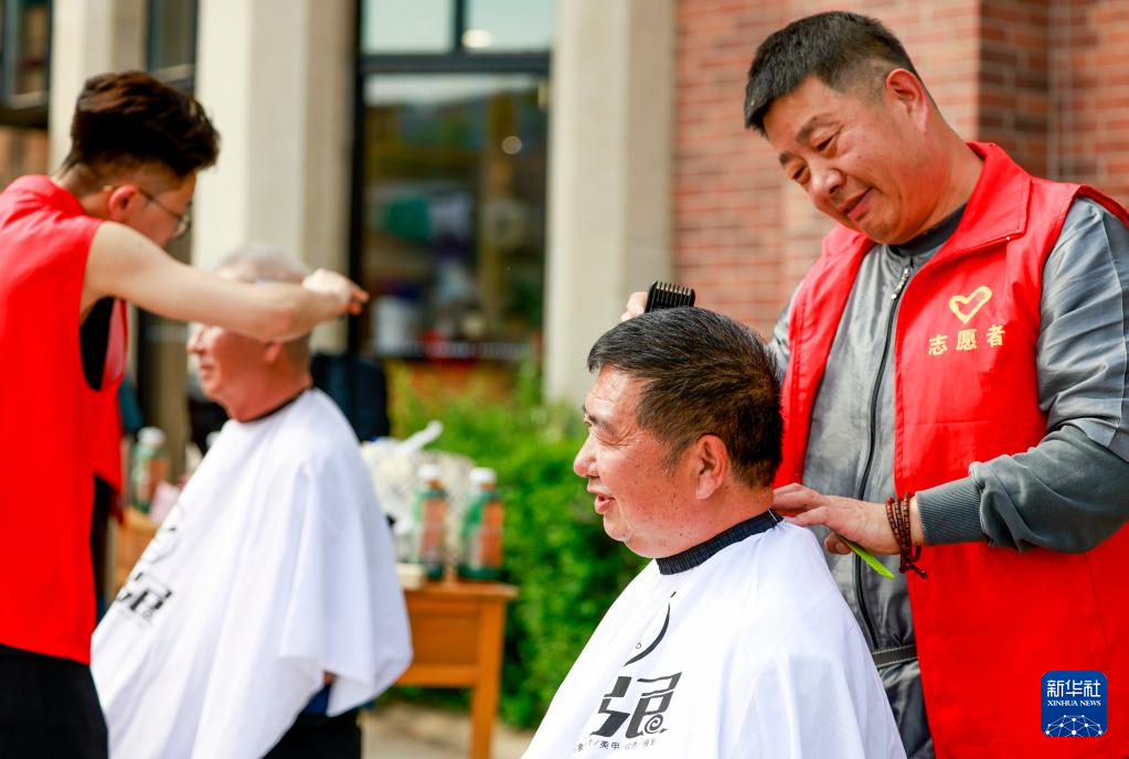 4月27日,乌鲁木齐市水磨沟区七纺街道北山社区的志愿服务队为居民免费理发。