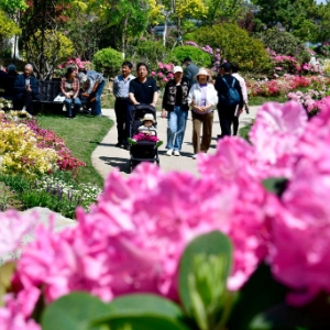 眼下,在山东日照山海天旅游度假区中国杜鹃花博览园,杜鹃花竞相开放,吸引了众多游客游园赏花。
