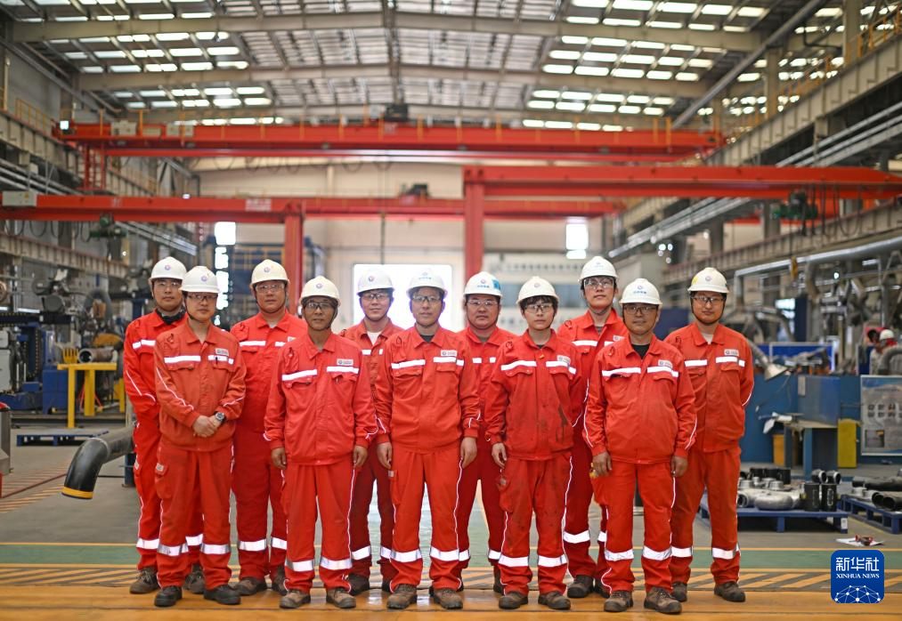 4月29日,刘海林(前中)在海油工程天津智能制造基地车间内和工作室同事合影。