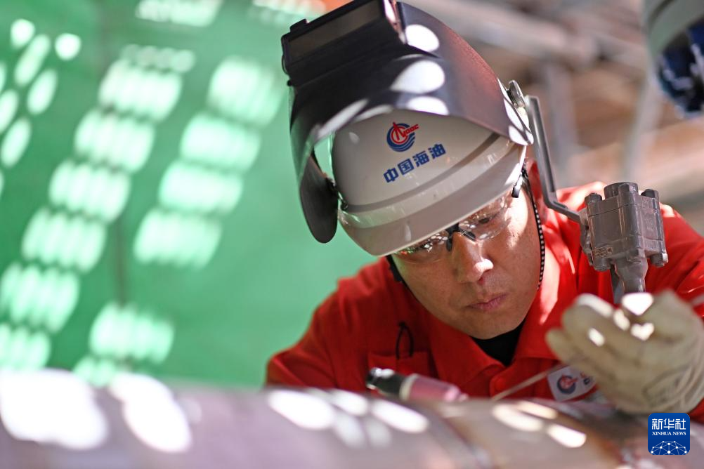 4月29日,刘海林在位于海油工程天津智能制造基地的工作室检查一处焊缝。