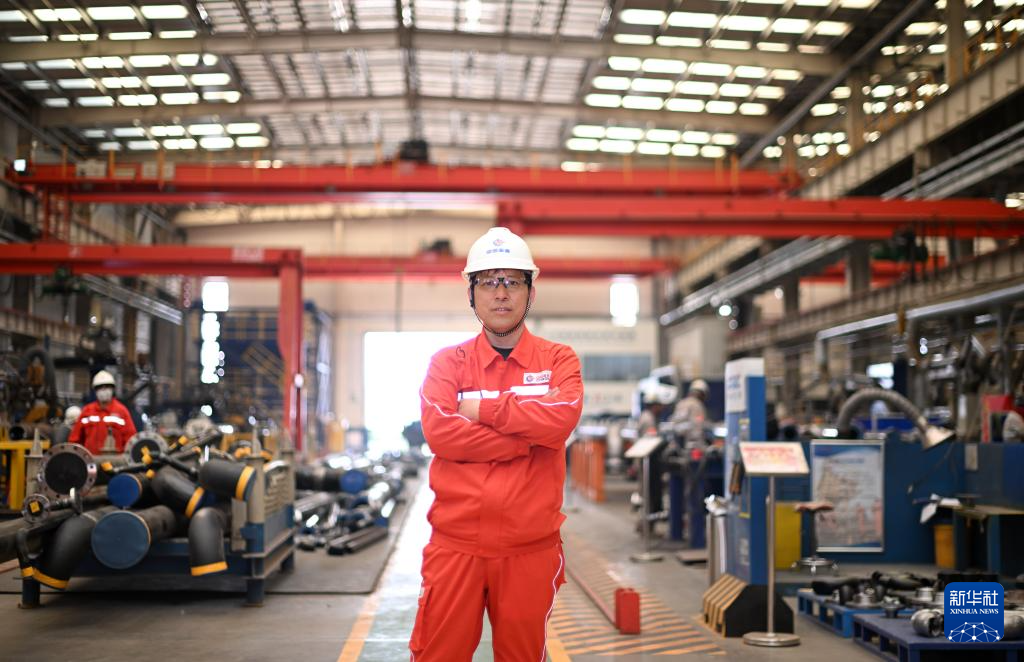 这是4月29日在海油工程天津智能制造基地车间拍摄的刘海林肖像。
