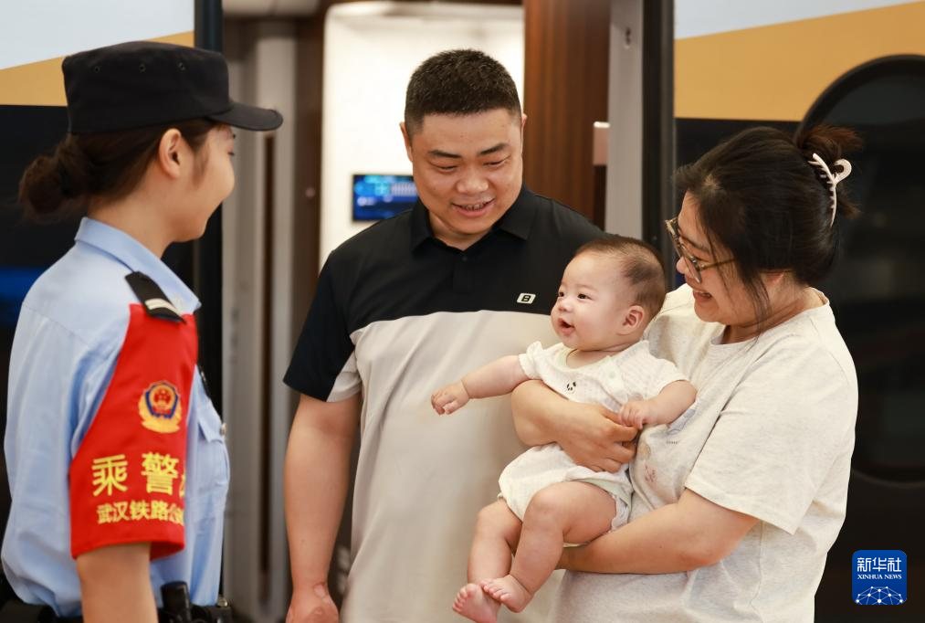 4月30日,在武汉站的列车上,女乘警与乘车旅客交流。