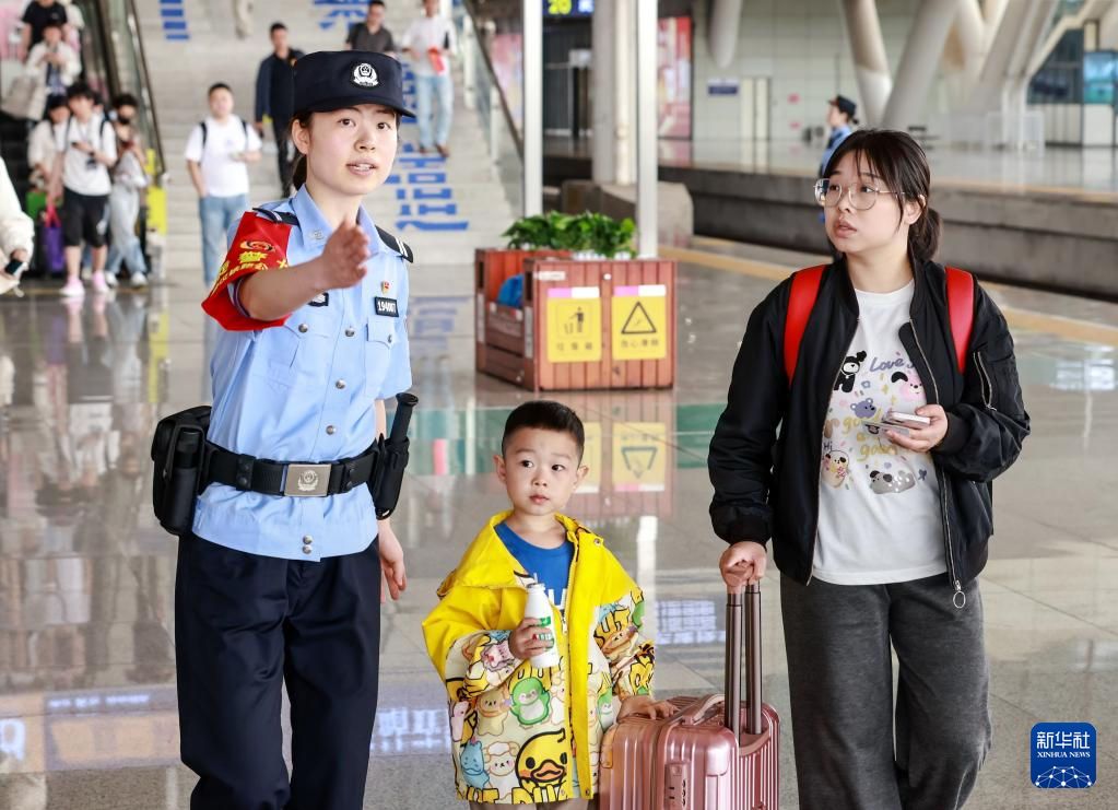 4月30日,在武汉站,女乘警指引旅客乘车。