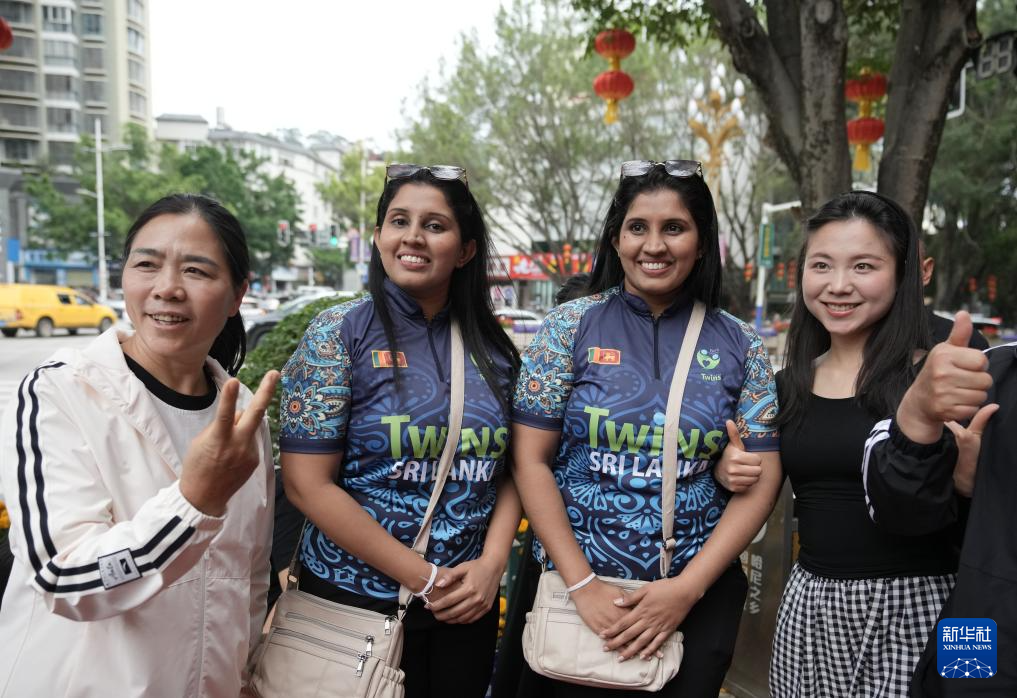 5月1日,一对来自斯里兰卡的双胞胎在墨江县双胞胎节上和市民合影。