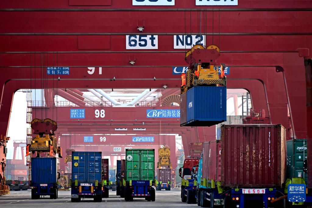 4月30日,货运卡车在青岛港前湾集装箱码头接送集装箱。