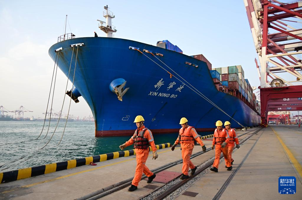 4月30日,在青岛港前湾集装箱码头,工人准备为即将起航至东盟港口的“中远新宁波”轮解缆。