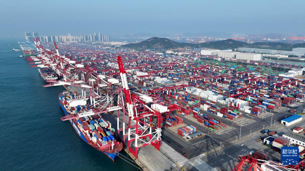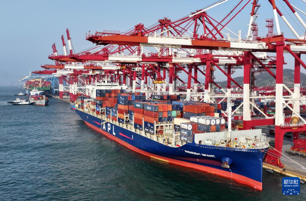 4月30日,货轮在青岛港前湾集装箱码头装卸集装箱(无人机照片)。