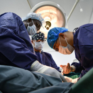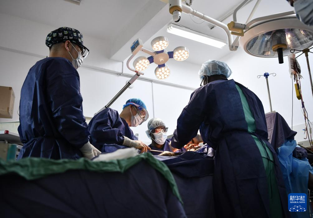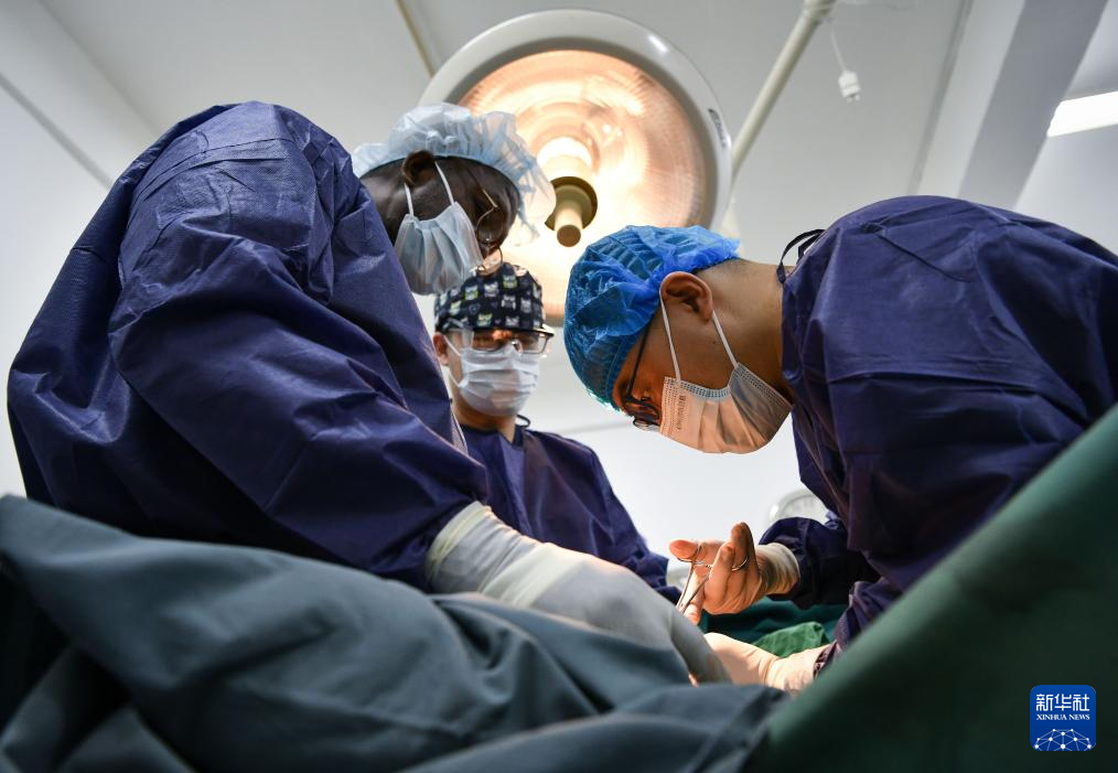 4月29日,在位于几内亚首都科纳克里的中几友好医院,中方医生与当地医生为患者做手术。