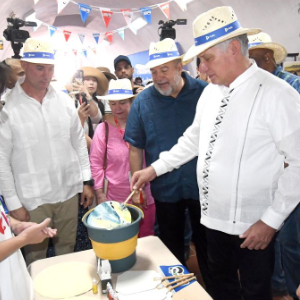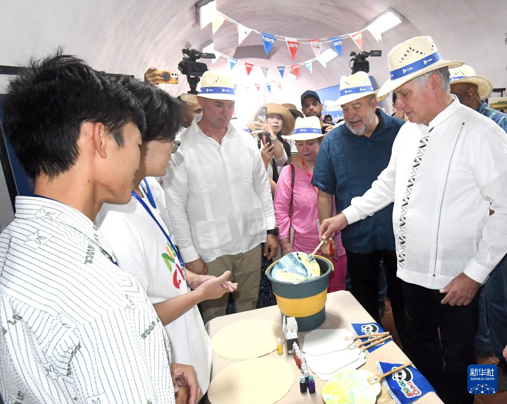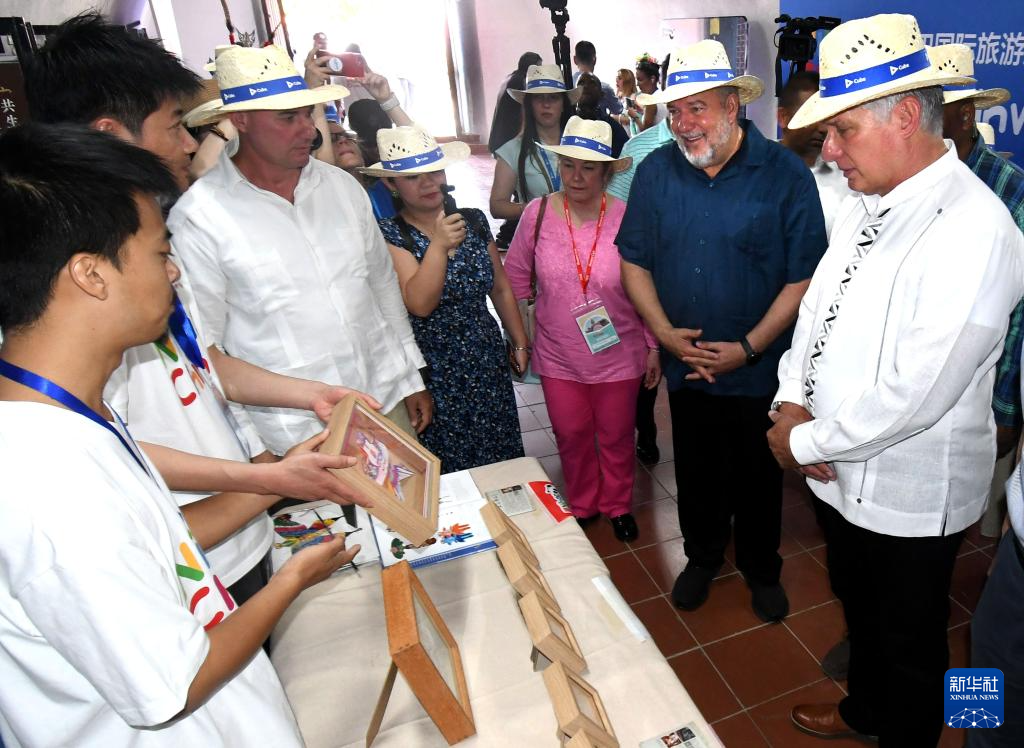 5月2日,在古巴首都哈瓦那,古巴国家主席迪亚斯-卡内尔(右一)参观第43届古巴国际旅游博览会中国主题展馆。