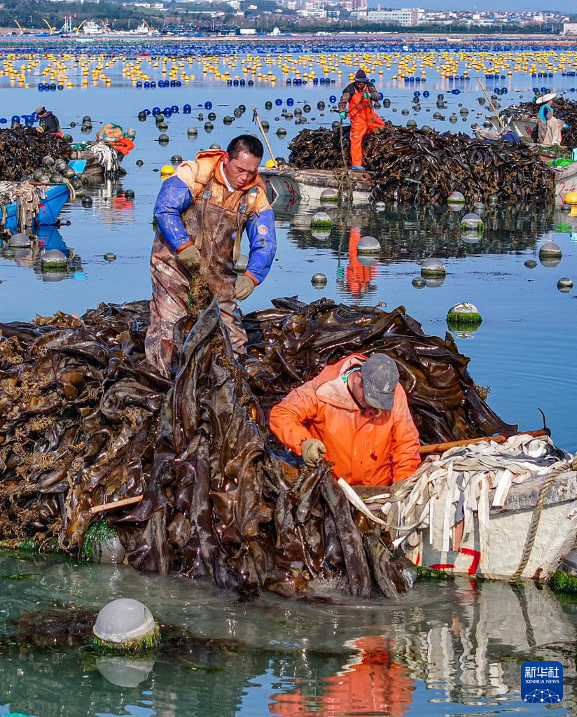 最近,山东省荣成市爱伦湾海洋牧场海带养殖区的渔民抓住晴好天气抢收海带,供应市场。