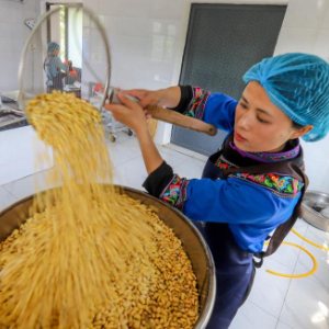 走进贵州省贵阳市乌当区偏坡布依族乡下院村的食品加工坊,“90后”返乡大学生陈星星和工人一起在制作、包装灰豆腐,赶制订单。