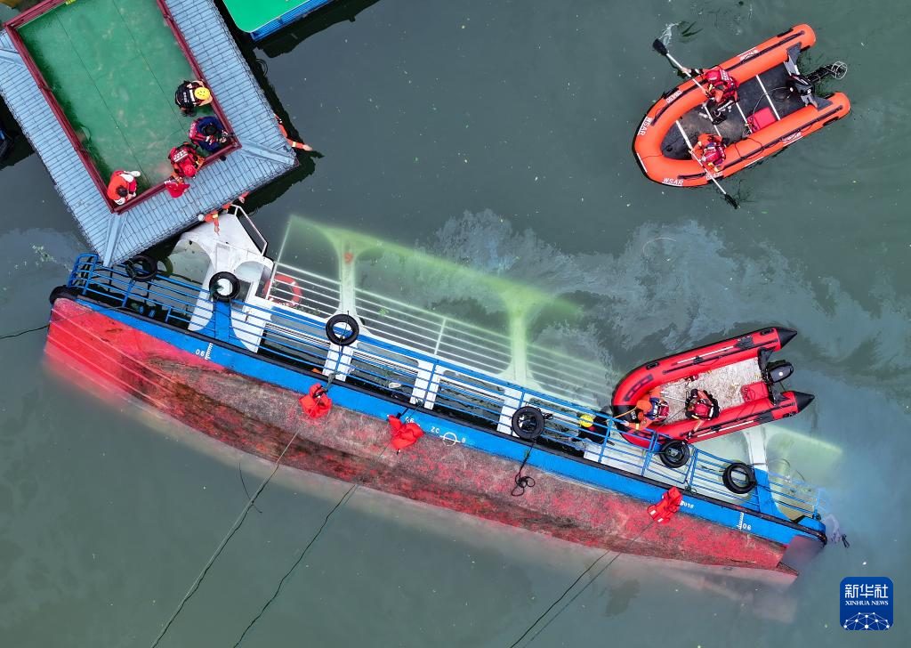 5月4日,救援人员在对倾覆船只进行搜救(无人机照片)。