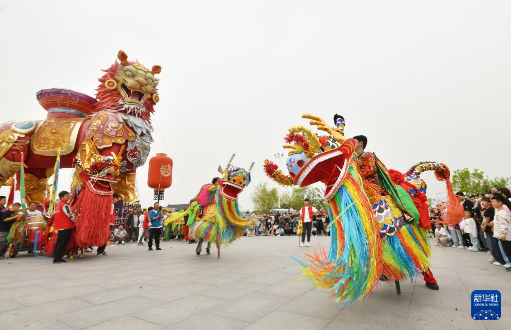 5月5日,游客在河北省沧州市园博园观看麒麟舞表演。