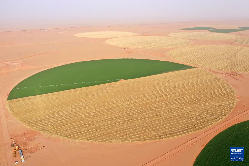 5月3日,收割机在埃及新河谷省的一处农场收获小麦(无人机照片)。该农场的灌溉用水来自中曼埃及公司在当地打的水井。