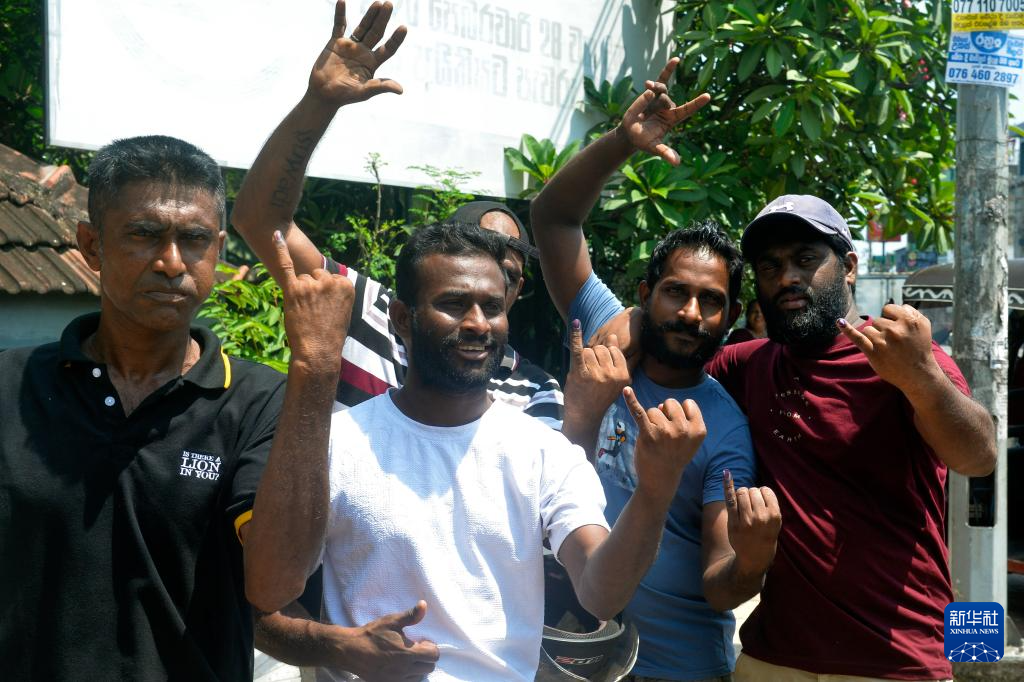 5月6日,在斯里兰卡加姆珀哈的一处投票站附近,斯里兰卡民众展示投票后涂上颜料的手指。