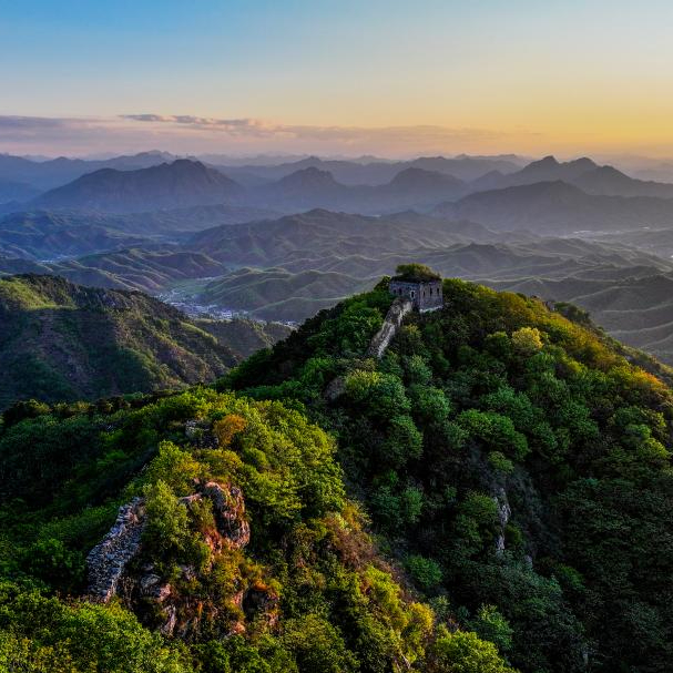 5月6日在河北省遵化市小厂乡拍摄的洪山口古长城晨景(无人机照片)。