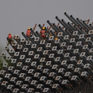 5月6日,中国铁建大桥局建设者在双屿门特大桥六横侧索塔高空平台施工。