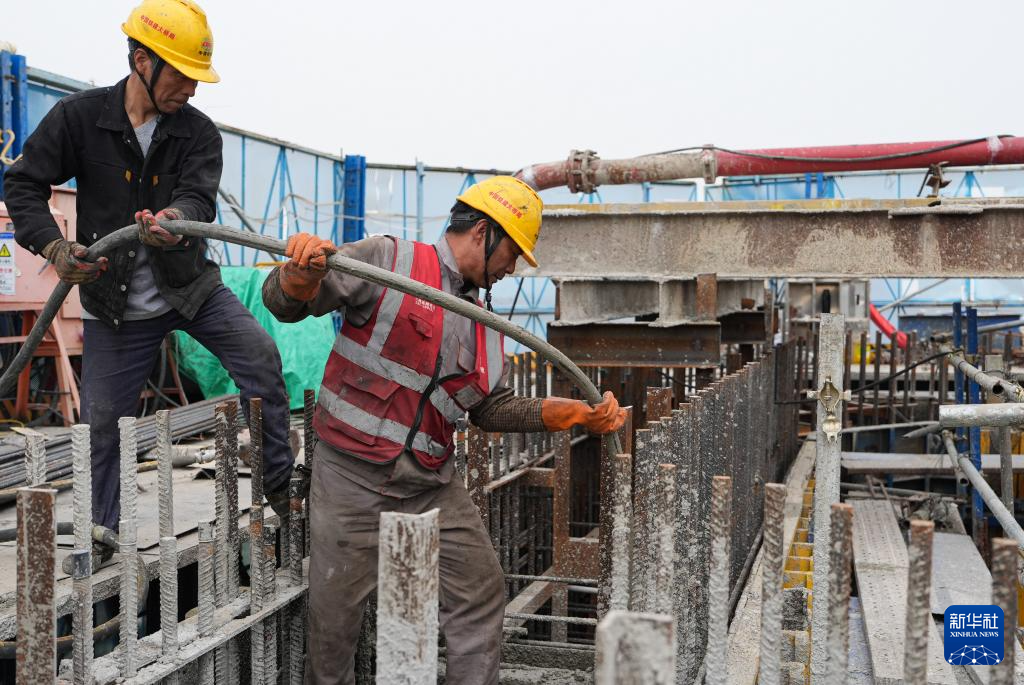 5月6日,中国铁建大桥局建设者在双屿门特大桥六横侧进行施工作业。