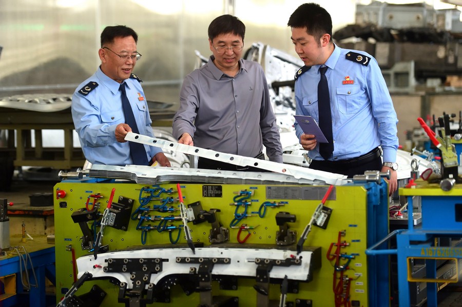 在沧州泊头一家石汽车模具制造企业,税务工作人员调研企业新产品研发情况,帮助企业合规享受税收优惠政策。新华网发(任立新 摄)