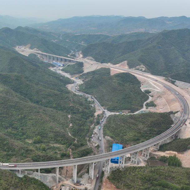 这是5月7日拍摄的石太高速改扩建项目石太高速与太行山高速互通施工现场(无人机照片)。