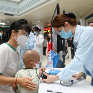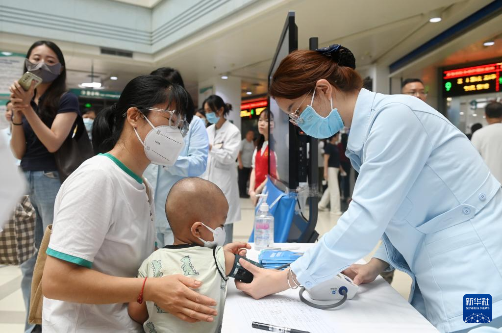 5月8日,在广西医科大学第一附属医院,医务人员在义诊现场提供测量血压服务。