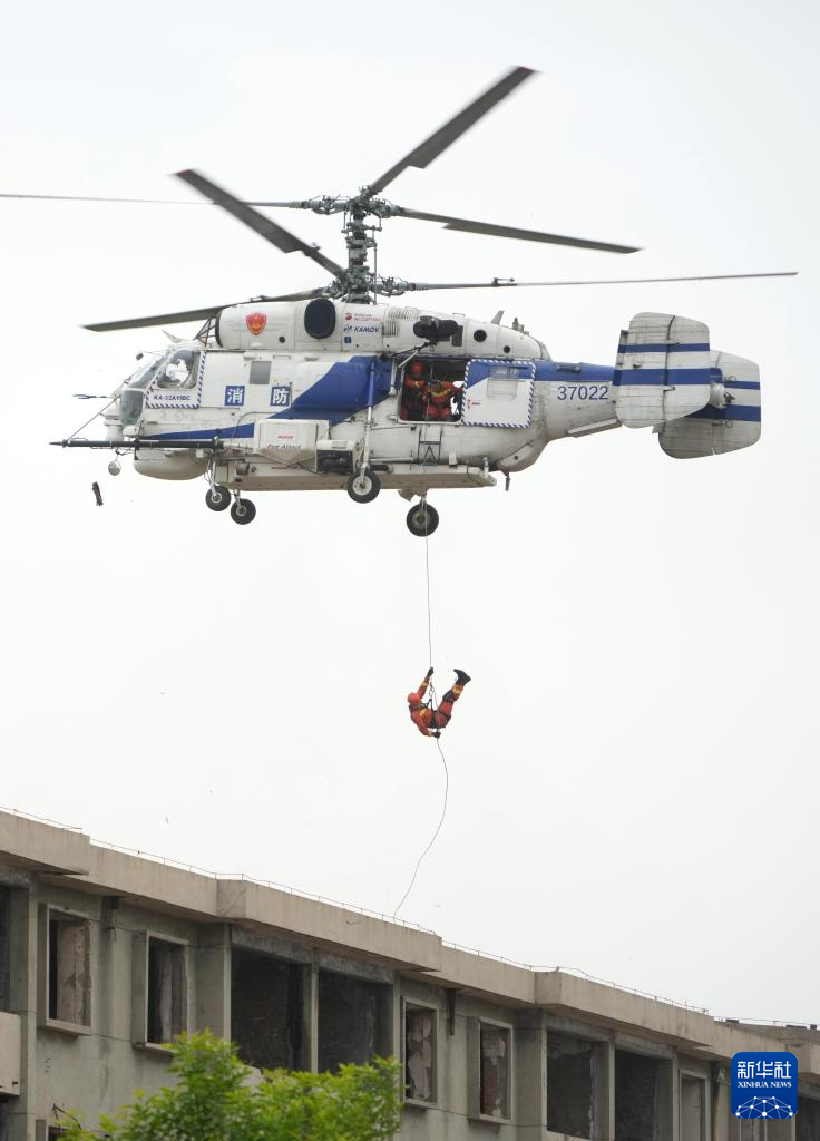 5月7日,地震救援队员在利用绳索系统进行演练。