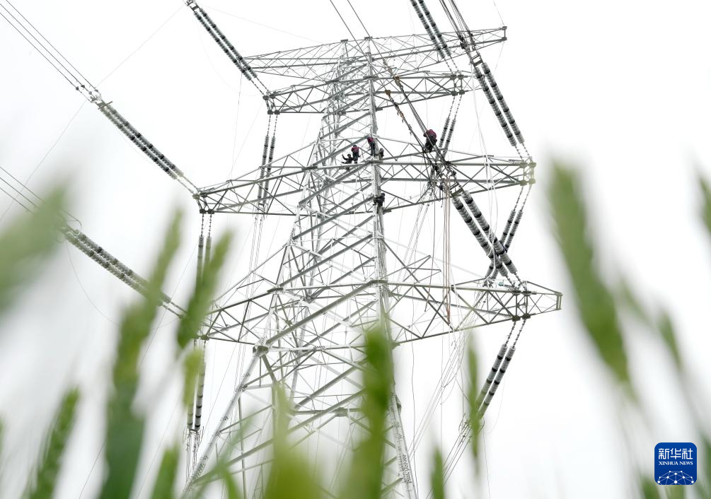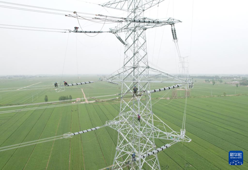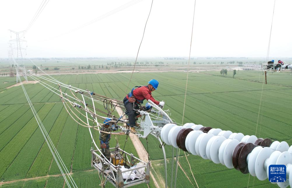 5月8日,工人在位于河北省新河县境内的国网邢台北500千伏特高压输变电工程线路建设工地施工。