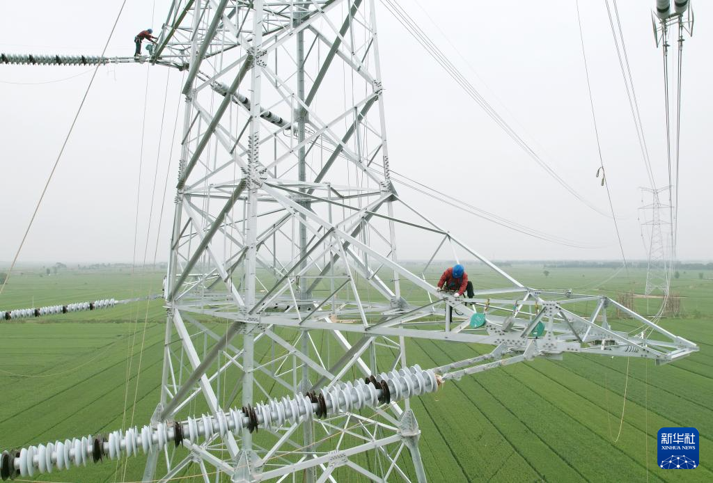 5月8日,工人在位于河北省新河县境内的国网邢台北500千伏特高压输变电工程线路建设工地施工(无人机照片)。