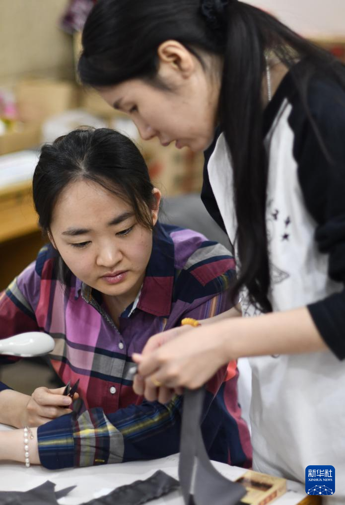 国家级非物质文化遗产盛锡福皮帽制作技艺代表性传承人、全国“五一”劳动奖章获得者李金善(右二)在车间内给年轻技师讲授选皮配料的技艺(4月22日摄)。