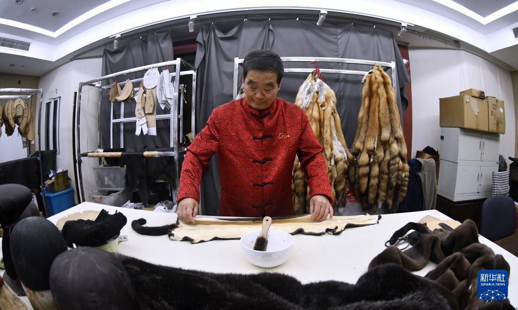 国家级非物质文化遗产盛锡福皮帽制作技艺代表性传承人、全国“五一”劳动奖章获得者李金善在车间内裁制制作皮帽的皮张(4月22日摄)。