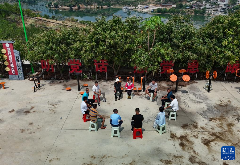 5月8日,卢丹在致富村向村民宣讲两会精神(无人机照片)。
