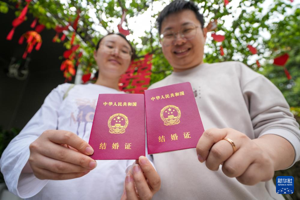 5月10日,南京市玄武区婚姻登记处工作人员为一对新人发结婚证。