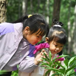 5月10日,小朋友在北京市平谷区东高村镇前台头村芍药花种植基地闻花香。