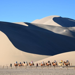 5月10日,游客乘骑骆驼在甘肃省敦煌市鸣沙山月牙泉景区游览。