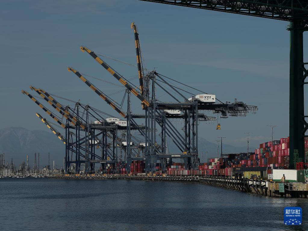 这是5月10日在美国洛杉矶港拍摄的货船。